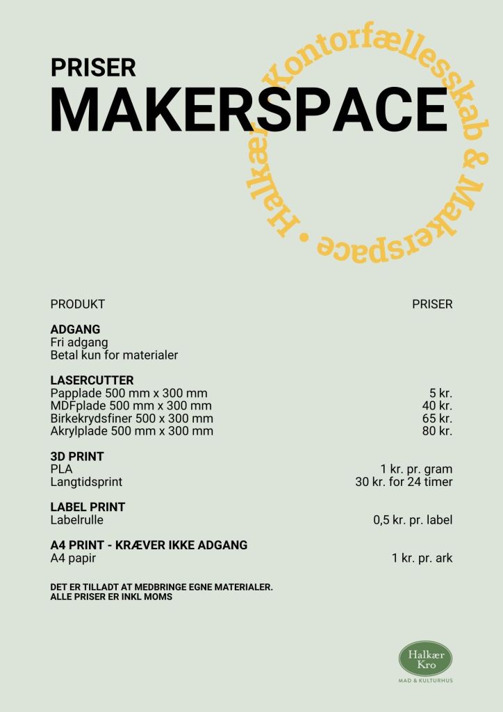Halkær Kontorfællesskab er ikke kun et arbejdsmiljø – det er også et innovativt makerspace. Her er plads til at udvikle idéer, skabe nyt og arbejde kreativt i inspirerende rammer med bl.a. 3D printer, laserskærer og labelprinter. Så hvis du arbejder med innovation, produktudvikling, mangler labels på dine hjemmebryggede øl eller noget helt fjerde, så har vi faciliteterne.